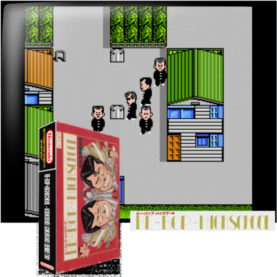 Be-Bop 高中:Koukousei Gokuraku Densetsu(“Be-Bop 高中:高级天堂传奇”)是一款 NES 冒险/角色扮演游戏,讲述了一群日本高中不良少年的不幸遭遇。