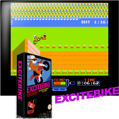 Race by yourself against the clock or compete with other motocross riders on 5 tracks full of long straights, large jumps and obstacles to win the Excitebike championship. Create your own tracks by p...
