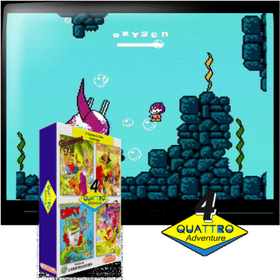 Quattro Adventure features four action/adventure games on one cartridge. - Boomerang Kid: It's a little known fact that boomerangs don't actually return when you chuck them. It took the Boomerang Ki...